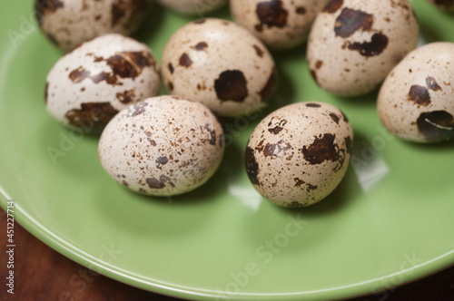 © Alexander Kurlovich, Fototapeta premium Quail eggs on a green ceramic plate