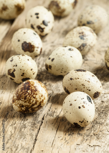© 5ph, Obraz premium Quail eggs on a wooden table, selective focus