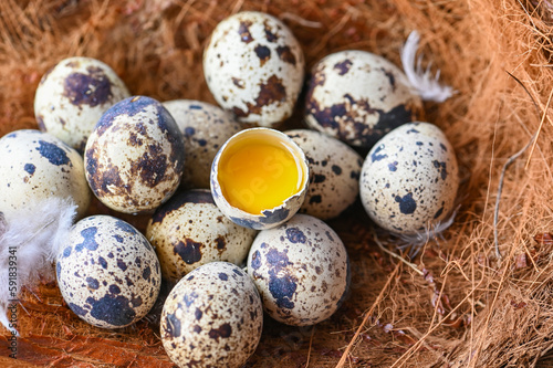© Bigc Studio, Obraz premium quail eggs on birds nest, fresh quail eggs and feather on wooden table background, raw eggs with peel egg shell