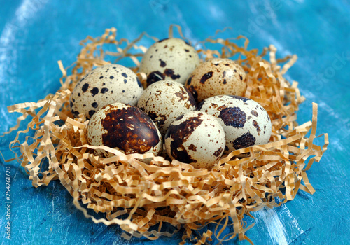 © Oksana, Obraz premium Quail eggs on blue background. Easter design.