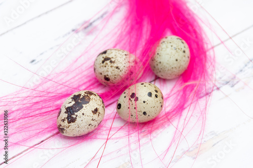 Obraz premium Quail eggs with pink feathers on white background. Easter concept.