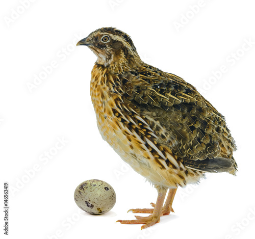 © sergei_fish13, Naklejka premium Quail hen and egg isolated on white. Domesticated quails are important agriculture poultry