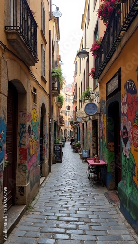 Fototapeta premium Quaint alley with street art cafes and cobblestones