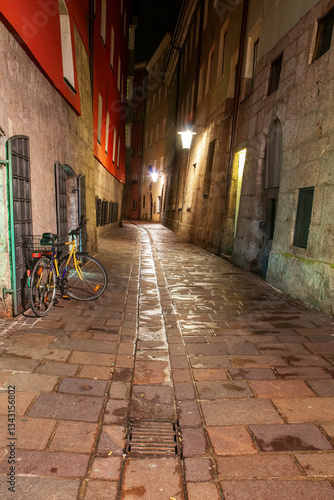 Fototapeta premium Quaint cobblestone alley in Innsbruck's historic center illuminated by warm streetlights. A colorful bicycle adds character to the scene, highlighting the city's blend of old and new