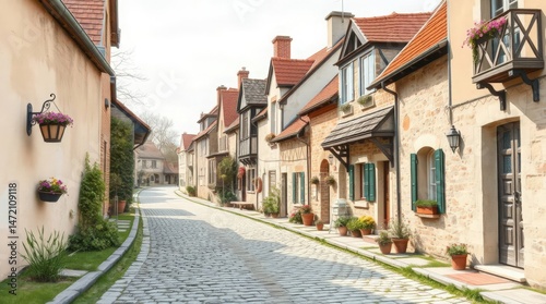 © Kraitong, Obraz premium Quaint Cobblestone Street in Charming Historic Village Setting