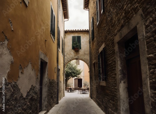 Obraz premium Quaint European Alley with Archway and Courtyard