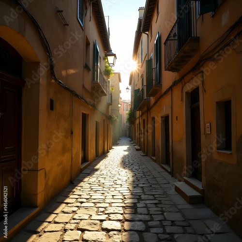 Fototapeta premium Quaint European Alleyway Bathed in Golden Sunset Light