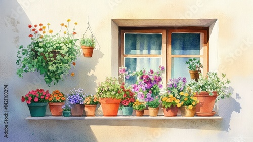© Friendly Studio, Naklejka premium Quaint flower store front captured in watercolor, overflowing with vibrant pots and rustic charm