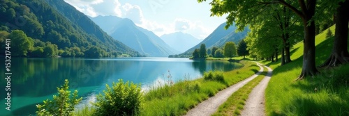 Naklejka premium Quaint lakeside lane, lush greenery, stunning vista , lake, scenic