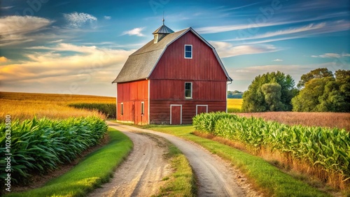 Obraz premium Quaint red barn on farm with dirt path through cornfields