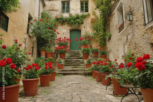 © VR, Naklejka premium Quaint stone alleyway with potted flowers and charming steps leading to an old-world atmosphere