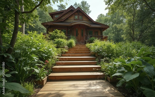 © Anarkali Art, Fototapeta premium Quaint Wooden Cabin Nestled in Lush Green Forest