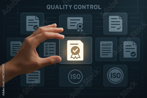 Fototapeta premium Quality control concept with hand selecting certificate icon digital...