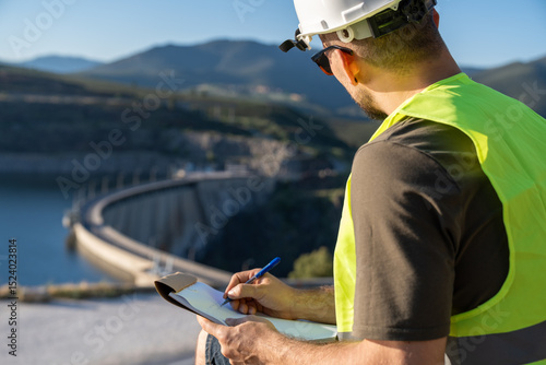 Naklejka premium Quality controller inspecting a dam and taking notes