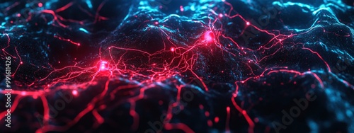 © Arti, Obraz premium Quantum computing interface displaying entangled particles, soft red and blue glow from the screen