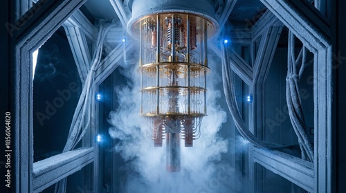 © Shamia, Obraz premium Quantum Computing Processor in Cryostat with Vapor and Ice Crystals