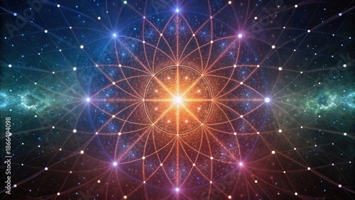 © Thanate, Fototapeta premium Quantum Cryptography Vibrant cosmic pattern with radiating lines and star-like nodes against a dark background.