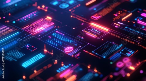 © Kankamol Tama, Fototapeta premium Quantum-enhanced UI design boards, glowing neon particles, sleek tech elements