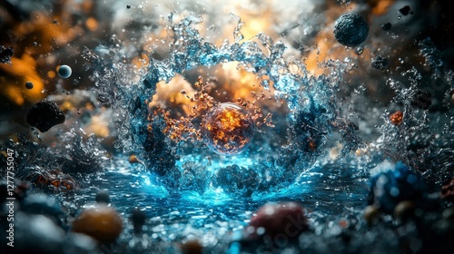 © สมเจตน์ หนูแก้ว, Obraz premium Quantum space travel action in surreal cosmic water collision abstract environment dynamic viewpoint