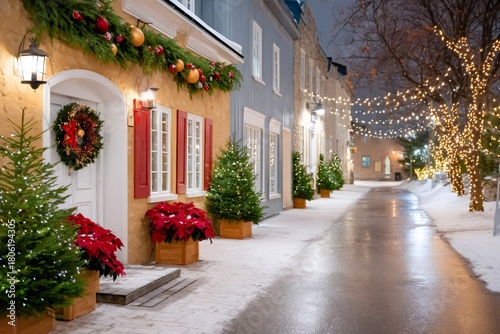 © kardaska, Fototapeta premium Quebec City street decorated with Christmas lights and snow