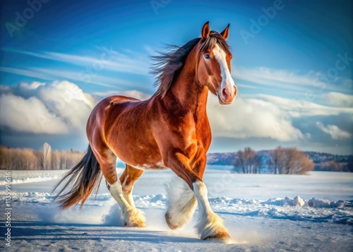 Obraz premium Quebec's winter wonderland frames a regal Clydesdale portrait; snow dusts its...
