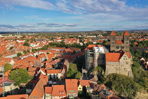 Obraz premium Quedlinburg. Stiftskirche St. Servatii auf dem Burgberg Quedlinburg mit historischer Altstadt, Luftbild