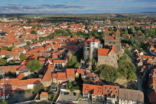 Obraz premium Quedlinburg. Stiftskirche St. Servatii auf dem Burgberg Quedlinburg mit historischer Altstadt, Luftbild