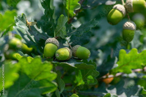 © Iva, Obraz premium Quercus robur green tree branches with leaves and unripened fruits acorns