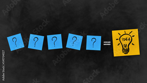 © ArtmediaworX, Obraz premium Questions and knowlage helps finding solutions and great ideas. Sticky notes with drawn doodles. Question marks and lightbulb