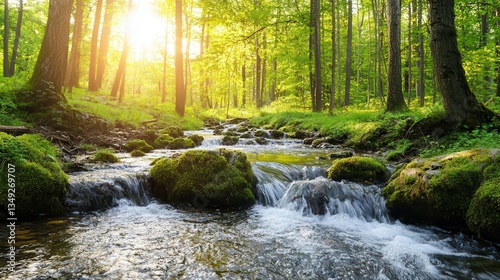 © pornchan, Obraz premium Quiet forest stream with small cascades over rocks, mosscovered banks and soft sunlight filtering through trees