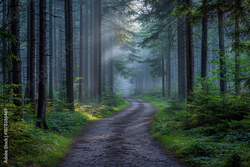 Fototapeta premium Quiet forest trail shrouded in morning mist near a serene grove