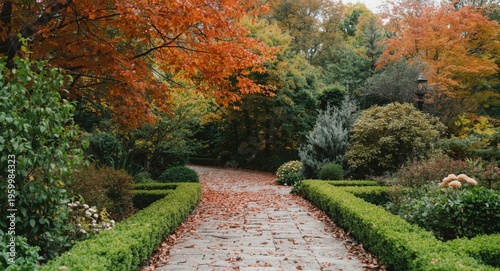Fototapeta premium Quiet garden path bordered by striking autumn tree colors