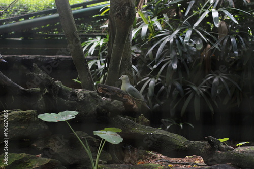 © Muchlis Nugroho, Fototapeta premium Quiet Green Birds Perched on Mossy Branch in Lush Garden