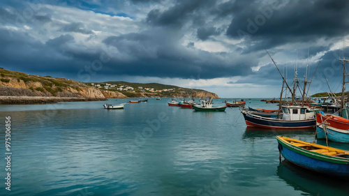 © Arceli, Fototapeta premium Quiet harbor with fishing boats anchored under a cloudy sky