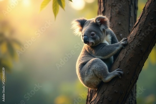 Fototapeta premium quiet koala rests on a branch of tall eucalyptus tree, misty morning light,...