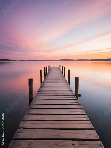 Naklejka premium Quiet lakeside pier with wooden planks extending into calm water under a soft pink and orange sky