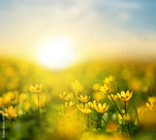 © Yuriy Kulik, Fototapeta premium quiet spring evening scene, heap of wild flowers on the sunset background