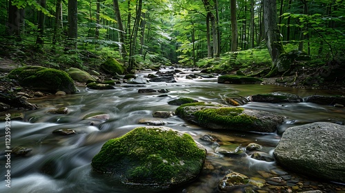 Obraz premium Quiet stream flowing through a dense forest surrounded by mosscovered rocks