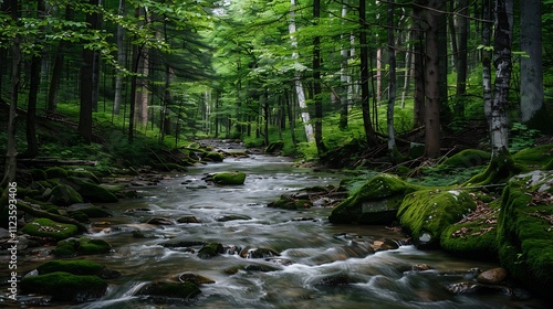 Obraz premium Quiet stream flowing through a dense forest surrounded by mosscovered rocks