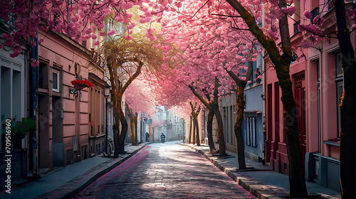 © Outlander1746, Fototapeta premium quiet street in the city during the cherry blossom season