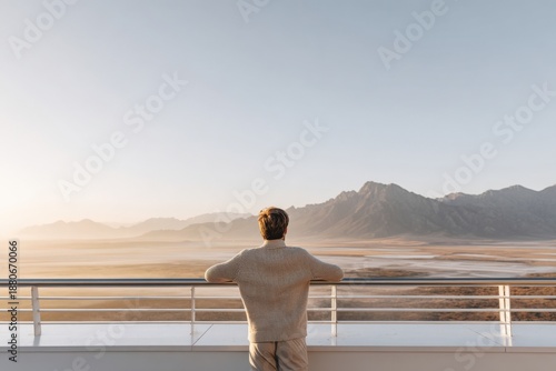 Naklejka premium quiet sunrise illuminating misty valleys, peaceful scene with soft light and...