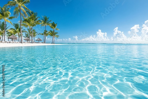 Fototapeta premium Quiet tropical poolside oasis with clear water and swaying palm trees under a...