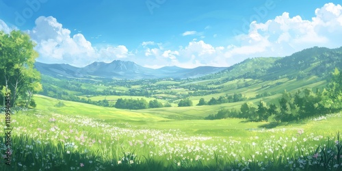 © Afif, Obraz premium Quiet valley with green fields and forest shadows