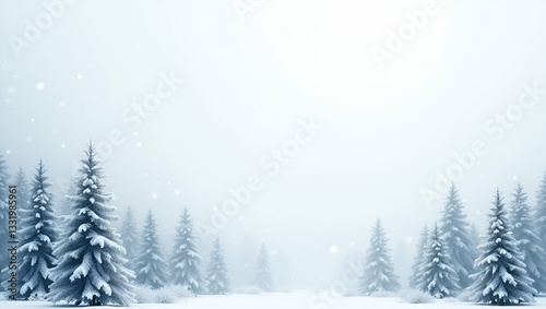 © Netaya, Naklejka premium Quiet Winter Snow Pattern with Frosted Pine Trees and Soft Snowflakes - Perfect for a Peaceful Winter Scene in Photo Stock with Empty Space for Text on the Left Side