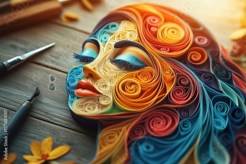 Fototapeta premium Quilling art of colorful woman’s face on wooden table