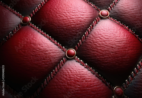 © Darcraft, Obraz premium Quilted red leather pattern with circular buttons, detailed texture, and braided seams. The upholstery design showcases a rich gradient of red hues, creating a luxurious appearance