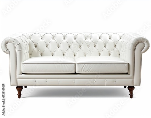 Obraz premium Quilted white couch with dark wood legs against a white background