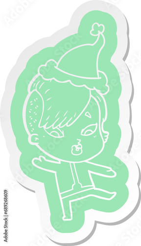 © lineartestpilot, Fototapeta premium quirky cartoon sticker of a surprised girl in science fiction clothes wearing santa hat