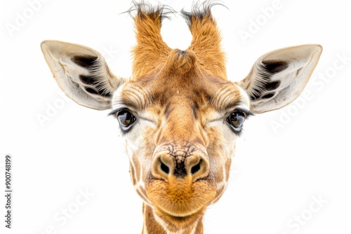 Naklejka premium Quirky giraffe with curious expression, bright and charming animal portrait, detailed fur texture, soft and warm light, isolated white background, endearing and cute safari animal.
