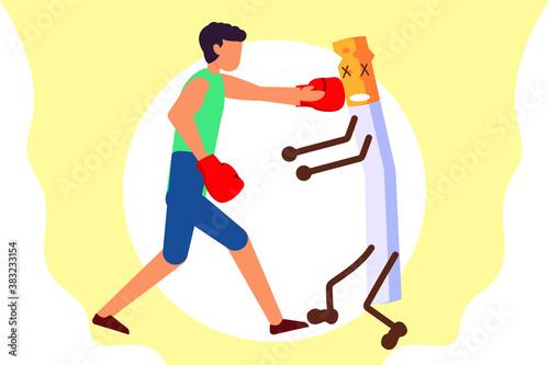 Fototapeta premium Quit smoking vector concept: Young male punching a cigarette while wearing boxing gloves